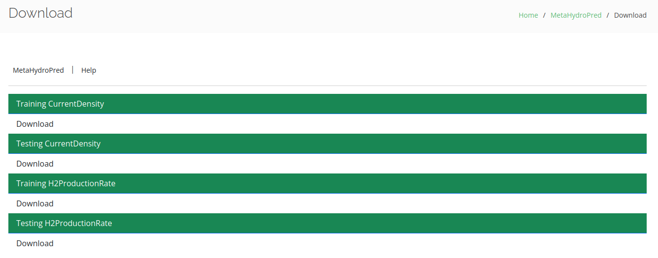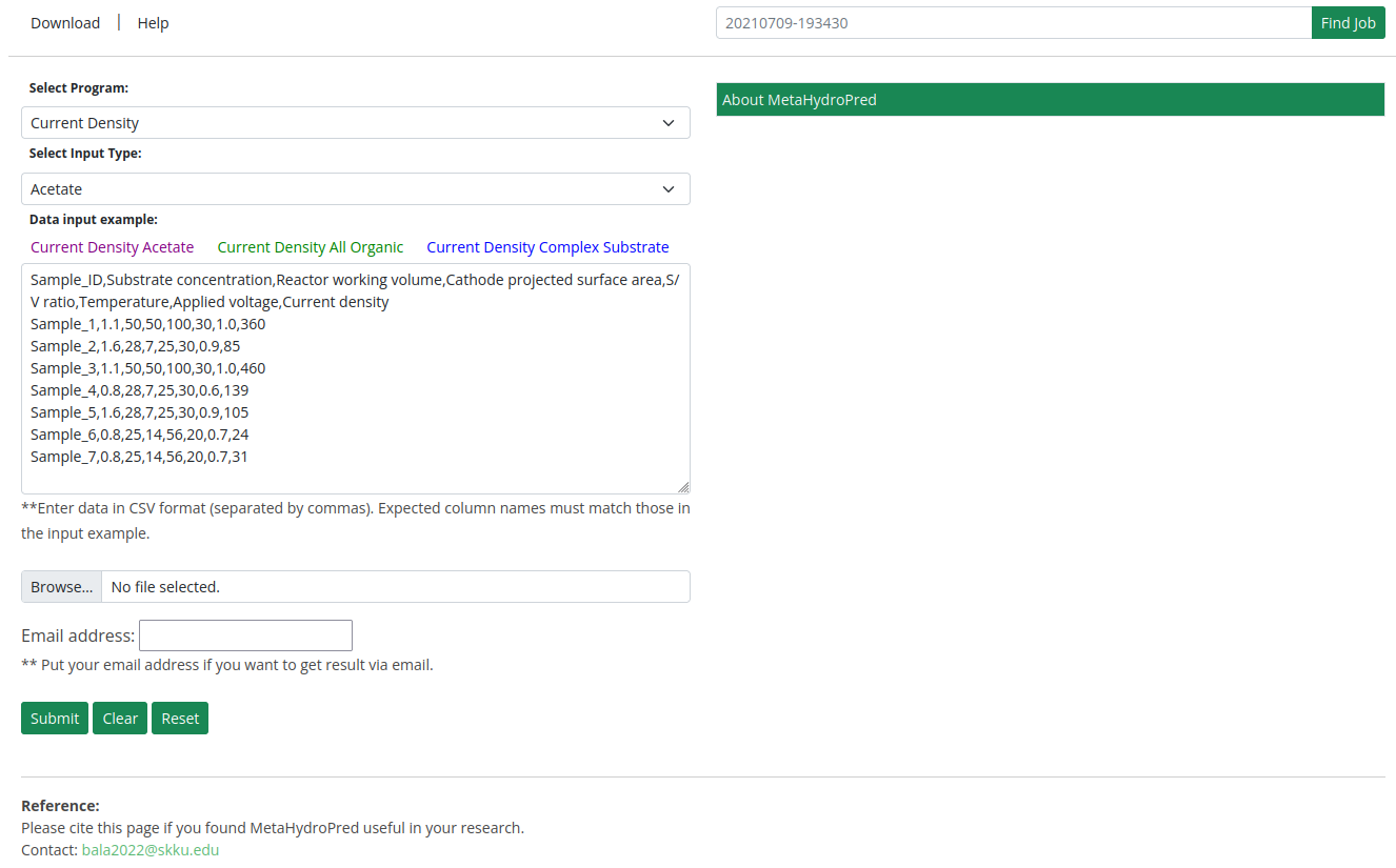 We have developed the MetaHydroPred prediction model for estimating H2 production rate and current density in Microbial Electrolysis Cells (MECs). Users can select the desired prediction type from the dropdown menu.