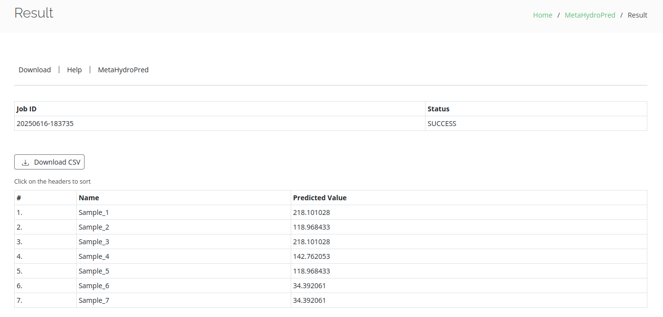 Ensure you select the correct model and prepare your input data in the required feature order. Users can click Example for easy testing of the MetaHydroPred web server.