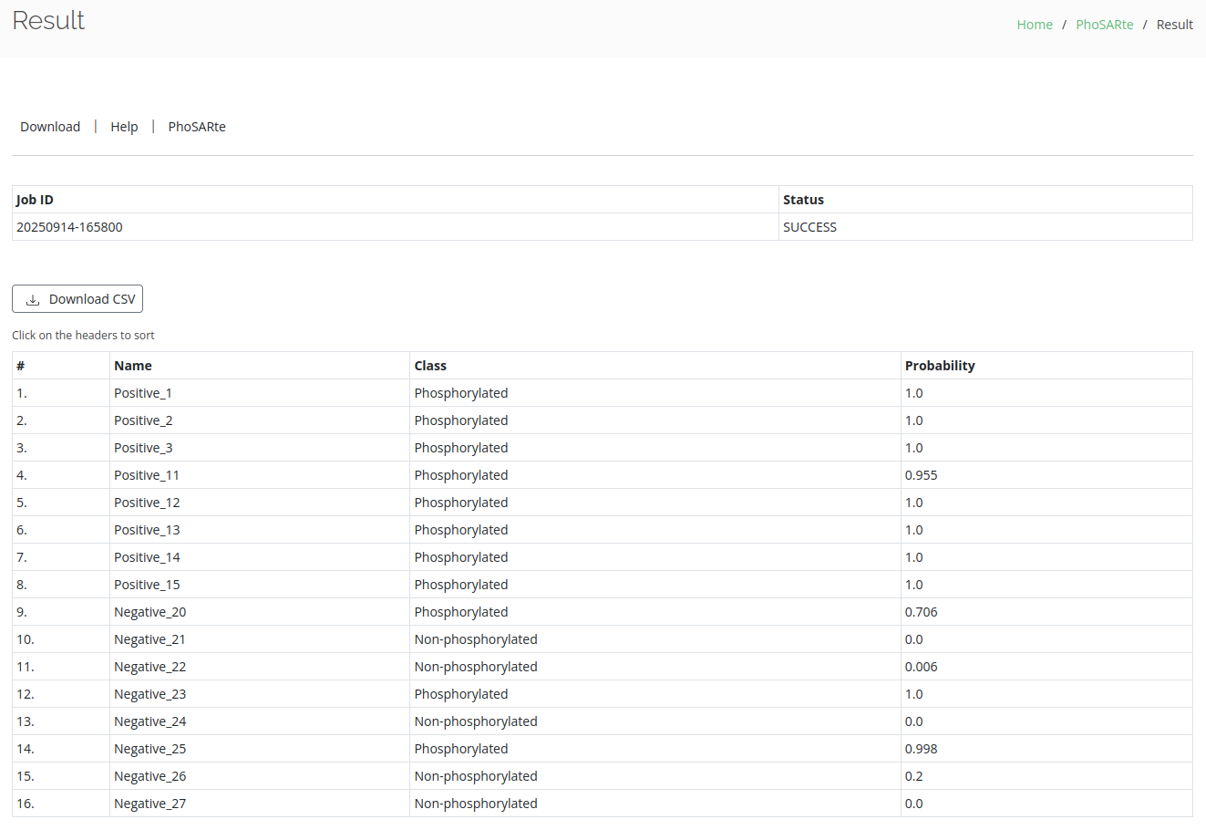 - Notably, the probability score ranges from 0 to 1, where a score close to 0 or 1 represents Non-phosphorylated or Phosphorylated, respectively.