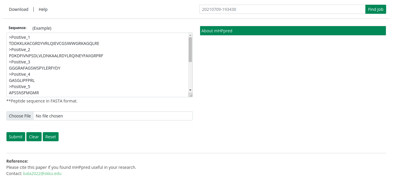 Step 2Paste your query peptide sequences into the input box or directly upload your input file via the "Choose File" button. The input sequences must be in the FASTA format otherwise the program will throw an error. We have provided a set of sample FASTA sequences. Users can click (Example) for easy testing of the mHPpred server.