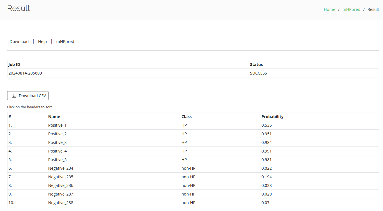 - Notably, the probability score ranges from 0 to 1, where a score close to 0 or 1 represents non-HP or HP, respectively.